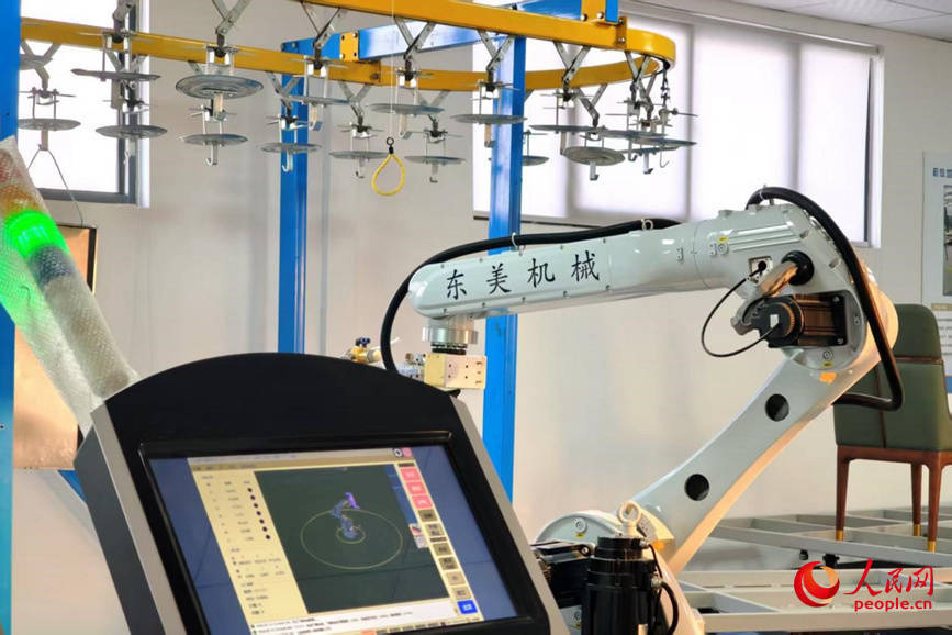 在秦中辉企业工厂的旁边,有一家做机器人智能喷涂、打磨的企业——河南东美机器人科技有限公司。负责人王颜涛说,智能喷涂、打磨原本在汽车制造等其他领域都已经很成熟,但是在家具行业才刚开始,因为很多家具板材都是定制的非标产品,所以这些智能机器臂,我们买回来以后仍然需要改造。