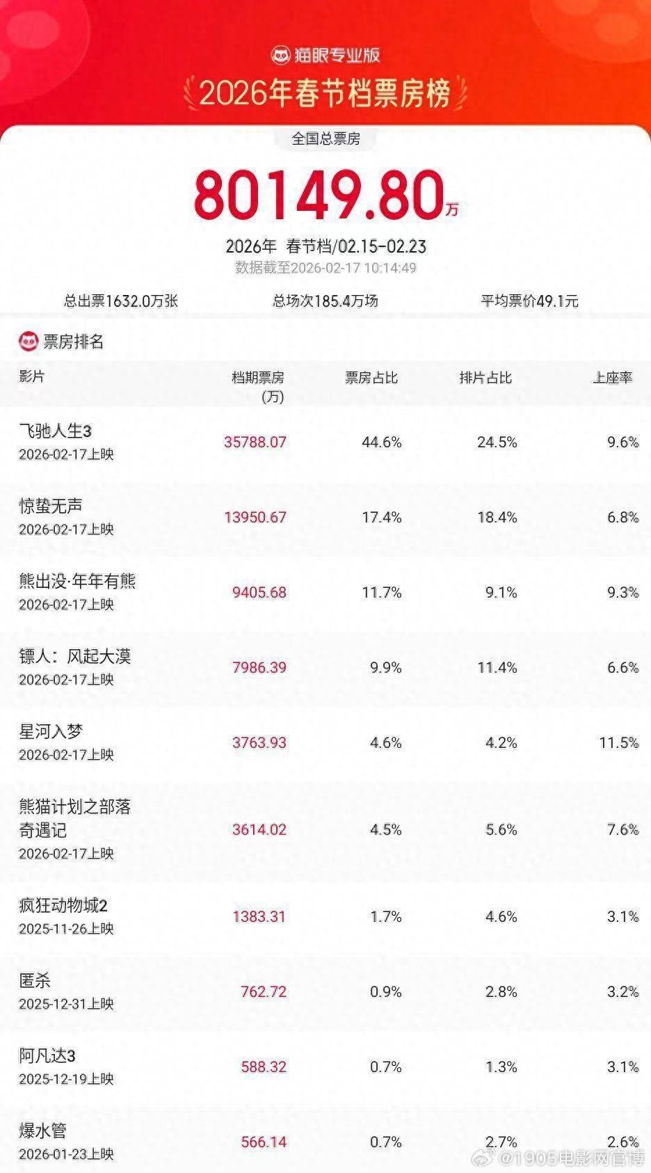 1905电影网讯 据猫眼专业版数据,2026年春节档档期总票房破8亿,《飞驰人生3》持续领跑。