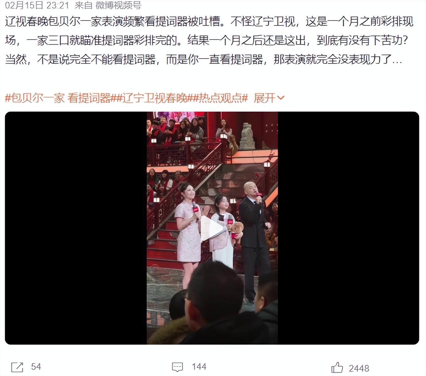 各位读者,除了央视的春晚外,你们看哪个卫视的春晚了?我们可以发现,各大卫视为了收视率纷纷邀请自带热度和流量的明星,但辽宁春晚,还是大家的首选,因为每年都有出圈的小品,但让大家没想到,今年辽宁春晚热度最高的话题竟是“包贝尔一家看提词器”,竟让网友们集体破防了,这究竟是怎么回事呢?